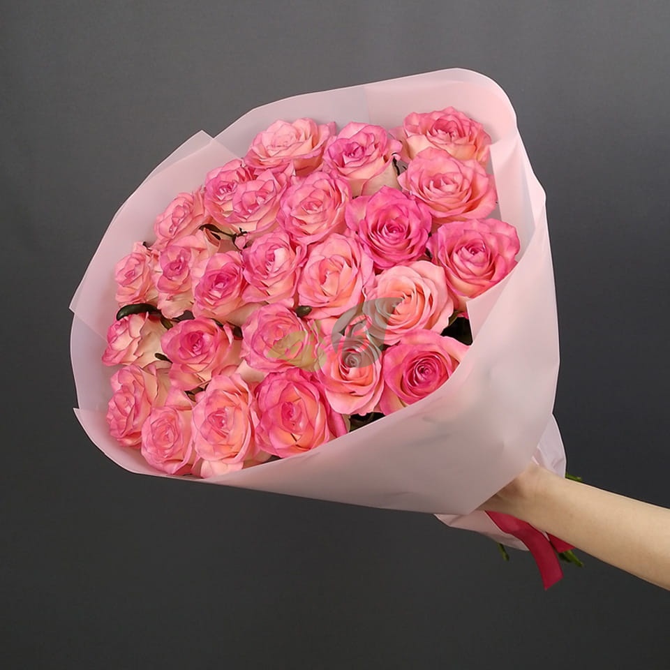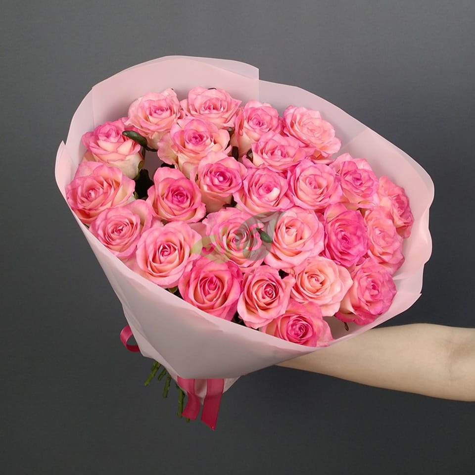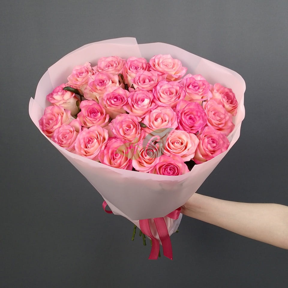 • Роза - 25 штук, цвет - бело-розовый, длина стебля - 60 см;